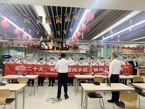 餐廳全員手持橫幅,鄭重宣誓:“在黨的二十大即將召開之際,我鄭重承諾:堅守安全紅線,全面落實崗位安全責任制。防范安全及防疫風險,消除安全隱患,不斷學習安全知識,努力提高安全意識,堅決遏制事故發(fā)生,保障餐廳運營安全。以良好的安全態(tài)勢迎接黨的二十大勝利召開。”